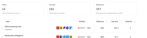 没有自定义提示监控,没有可见度或提及分数,也无法在没有点击时看到品牌出现在AI回答中的频率。你无法追踪哪些问题触发推荐,无法将提示覆盖与竞争对手进行比较,也无法识别有助于提升你在AI回答中存在感的缺口。