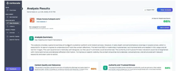你首先要进行网站分析。输入域名并选择爬行深度后,Rankscale 会分配一个整体的 AI 搜索准备度评分。该评分分为四个类别:
