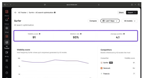 - 如果你想要追踪+提升AI可见度的强力结合,可以从Surfer AI Tracker开始