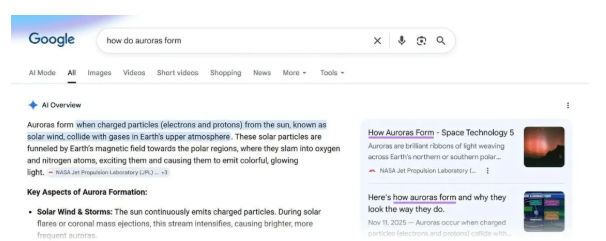 假设用户在谷歌上搜索“极光是如何形成的”。搜索引擎检测到用户想知道极光——也称为北极光和南极光——出现在天空中的过程。