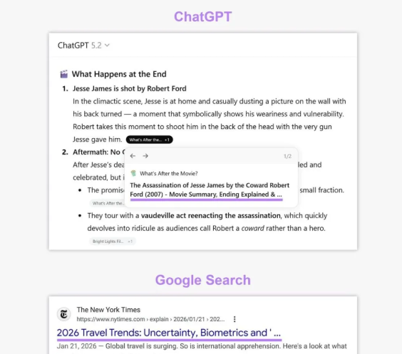 保持标题标签简洁的原因是,搜索系统可能会截断或重写过长的标题。就像这些标题在ChatGPT和谷歌搜索结果中被截断一样: