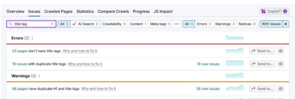 要使用Site Audit,请按照配置步骤作,然后进入“问题”标签页。搜索“title tag”,看看你的网站是否有标题标签相关的错误。