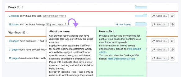 使用 Semrush 的网站审核工具,查找并修复您网站标题标签的问题,该工具能识别以下标题标签问题: